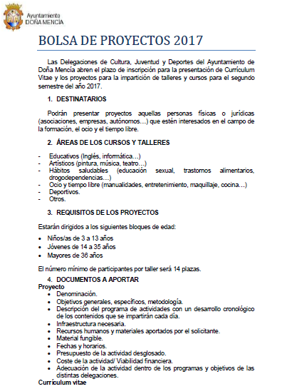 BolsaProyectos17Hasta el 2 de junio las delegaciones de Cultura, Juventud y Deportes del Ayuntamiento de Doña Mencía, tienen abierto el plazo de presentación de currículum y proyectos para la impartición de talleres y cursos durante el segundo semestre de 2017. Pueden presentar proyectos aquellas personas físicas o jurídicas interesadas en la formación, el ocio y el tiempo libre.