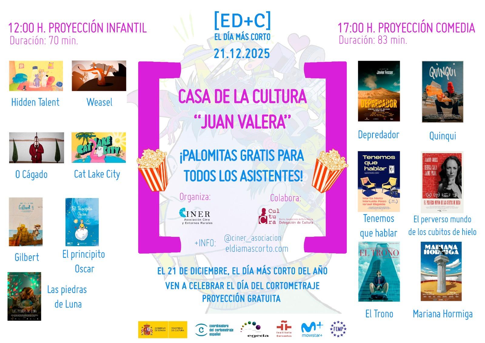 Este domingo, 21 de diciembre, Doña Mencía se suma a la celebración de una gran fiesta del cortometraje: El Día Más Corto. La asociación local “Cine y Entornos Rurales”, proyectará cortometrajes de temática infantil por la mañana (12´00h) y de comedia por la tarde (17´00h), en la Casa de la Cultura. Además ofrecerán palomitas gratis para todos los asistentes.
