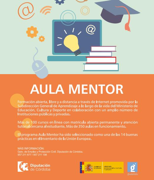 La Diputación de Córdoba y los centros Guadalinfo colaboran en la iniciativa formativa del Ministerio de Educación denominada “Aula Mentor“. El objetivo de este programa es ofrecer una alternativa de formación a la población adulta que no pueda acudir a la oferta habitual de cursos presenciales. “Aula Mentor” ofrece por ello cursos flexibles,a través de Internet, que permiten mejorar las competencias personales y profesionales de los participantes.