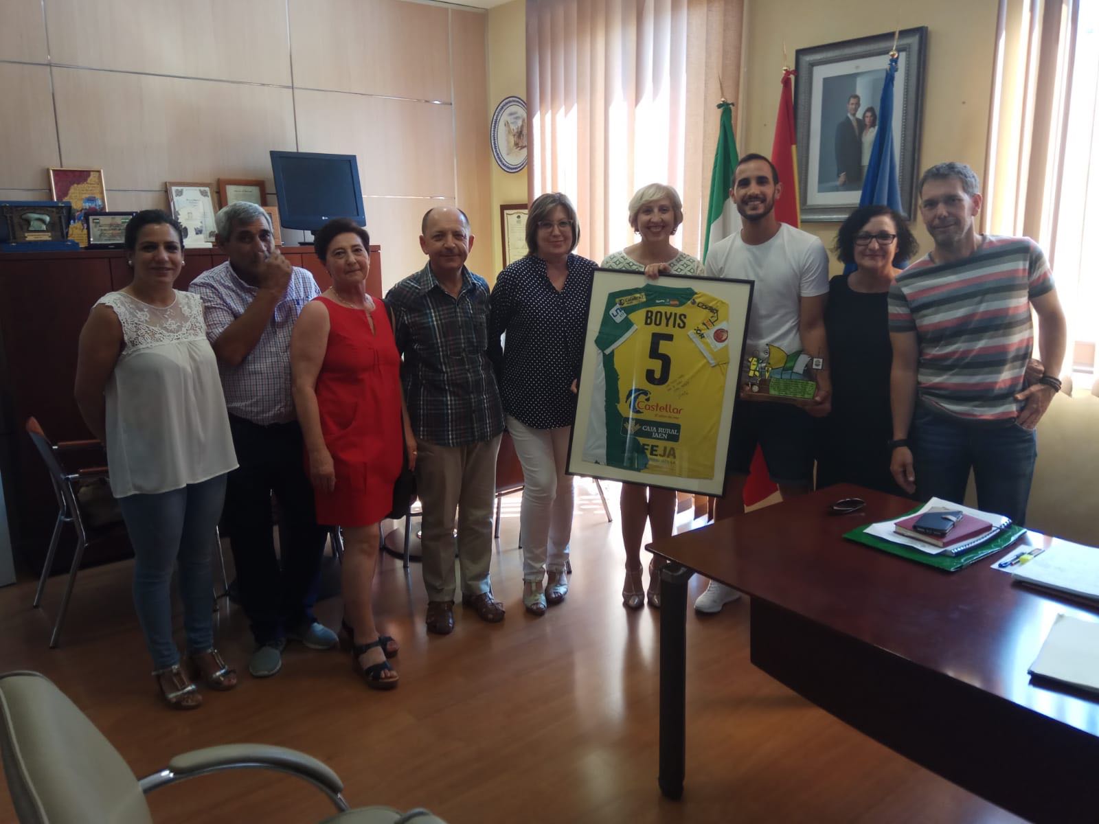 La corporación municipal ha recibido al deportista Antonio Manuel Sánchez Tienda “Boyis” para reconocer su brillante trayectoria deportiva y la histórica temporada que ha realizado este año con el Jaén Paraíso Interior de fútbol sala. El jugador de 28 años, fichaje del FC Barcelona, ha preferido un acto pequeño en el Ayuntamiento, poniendo así de relieve la humildad y sencillez que lo caracterizan. En el acto han estado presentes varios miembros de la corporación menciana que han mostrado sus felicitaciones a Boyis. El futbolista ha estado acompañado por sus padres y ha entregado al pueblo de Doña Mencía la equipación con la que disputó la pasada final de la Copa del Rey, firmada y dedicada, en agradecimiento al apoyo recibido por todos sus paisanos. Por su parte, desde el ente público se ha hecho entrega al jugador del Barça de una placa conmemorativa que recoge este reconocimiento.