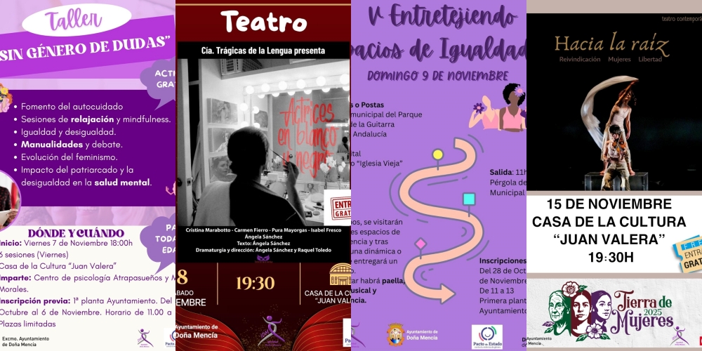Además, los dos próximos sábados, la Casa de la Cultura acogerá distintas representaciones teatrales incluidas en la conmemoración del Día Internacional de las Mujeres Rurales. La de este 8 de noviembre, a las 19´30 horas, se titula “Actrices en blanco y negro” y será puesta en escena por la compañía Trágicas de la Lengua. El 15 de noviembre, a la misma hora, Doña Mencía podrá disfrutar también de “Hacia la raíz“, una obra incluida en el programa de Diputación Tierra de Mujeres .